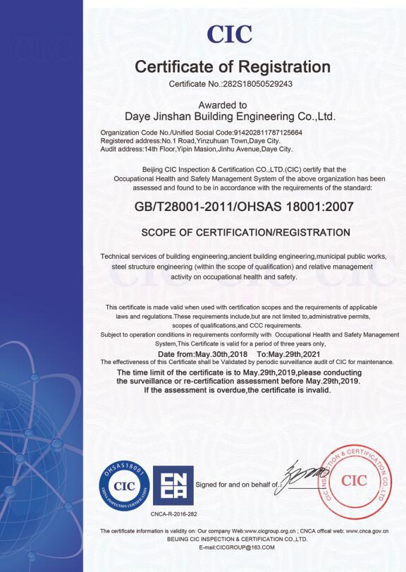 大冶金山建筑工程有限公司始建于1984年,屬鎮辦集體企業。1997年改制為大冶山建筑工程有限責任公司,屬股份制企業。2013年更名為大冶金山建筑工程有限公司,2018年3月公司資源重組,公司注冊資金達到10180.00萬元,公司法定代表人為劉瑞華。公司具有古建筑工程專業承包壹級、建筑工程施工總承包貳級、市政工程總承包叁級、鋼結構工程專業承包叁級資質。